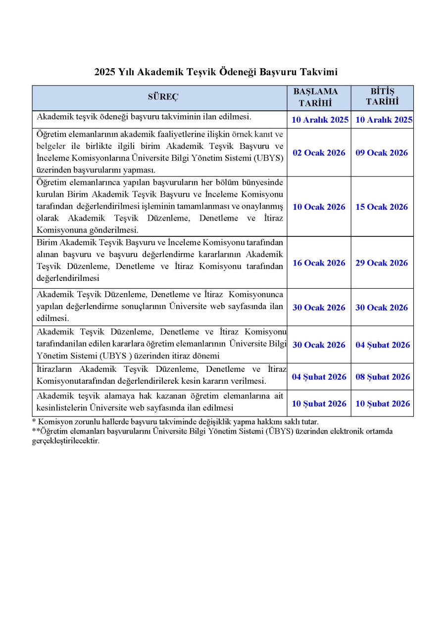 2025 yılı Akademik Teşvik Ödeneği Başvuru süreci öğretim elemanlarının akademik faaliyetlerine ilişkin örnek kanıt ve belgeler ile birlikte ilgili birim Akademik Teşvik Başvuru ve İnceleme Komisyonlarına Üniversite Bilgi Yönetim Sistemi (UBYS) üzerinden çevrim içi yapılacaktır.